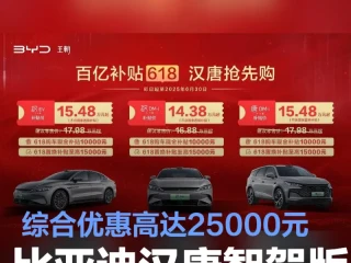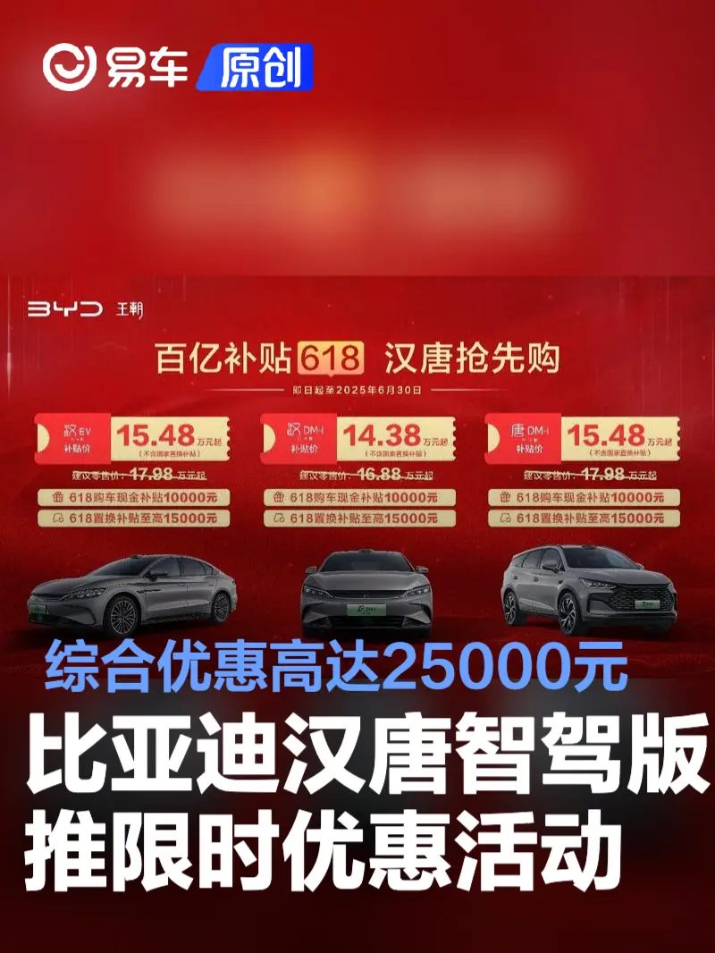 易车讯 比亚迪王朝官方宣布汉唐智驾版限时推出重磅福利组合:即日起至2025年6月30日,购车即享10000元现金直补,置换用户更可叠加至高15000元置换补贴,综合优惠高达25000元。汉EV智驾版补贴后15.48万元起,汉DM-i智驾版14.38万元起,唐DM-i智驾版15.48万元起。