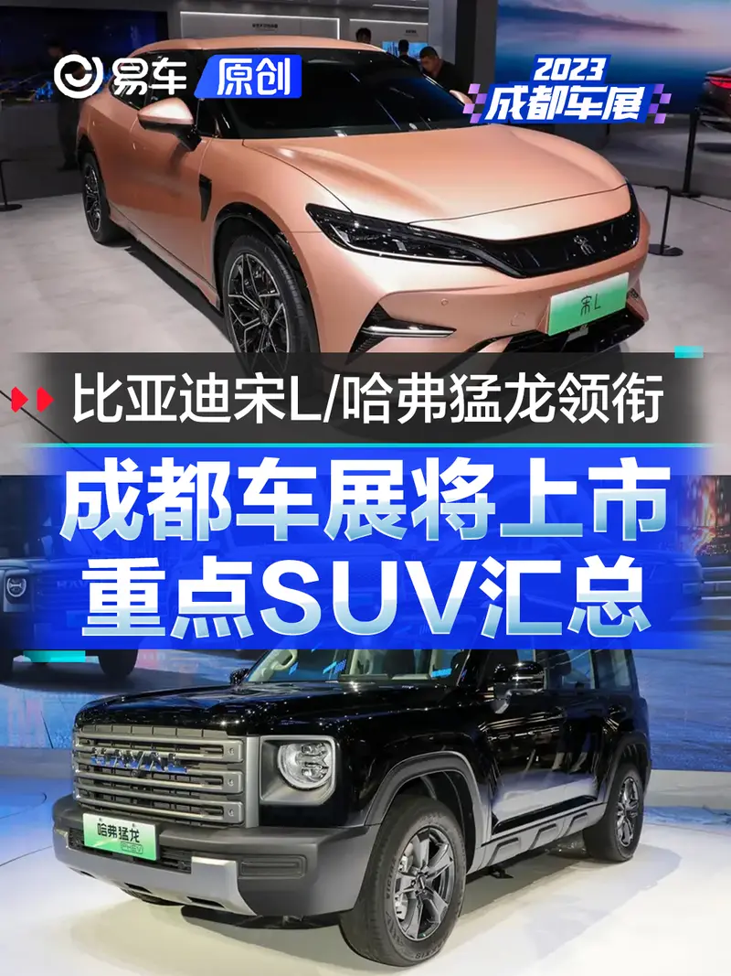 易车讯 在2023成都车展上,很多新车正式与大家见面,而其中不少新车也将在不久之后正式推向市场,这其中有不少车都具有很高的关注度,比如比亚迪宋L、哈弗猛龙、方程豹豹5、问界新M7大五座、智己LS6、极越01、起亚EV5等。下面就带大家一起来汇总下本届车展后将上市的重点SUV车型。