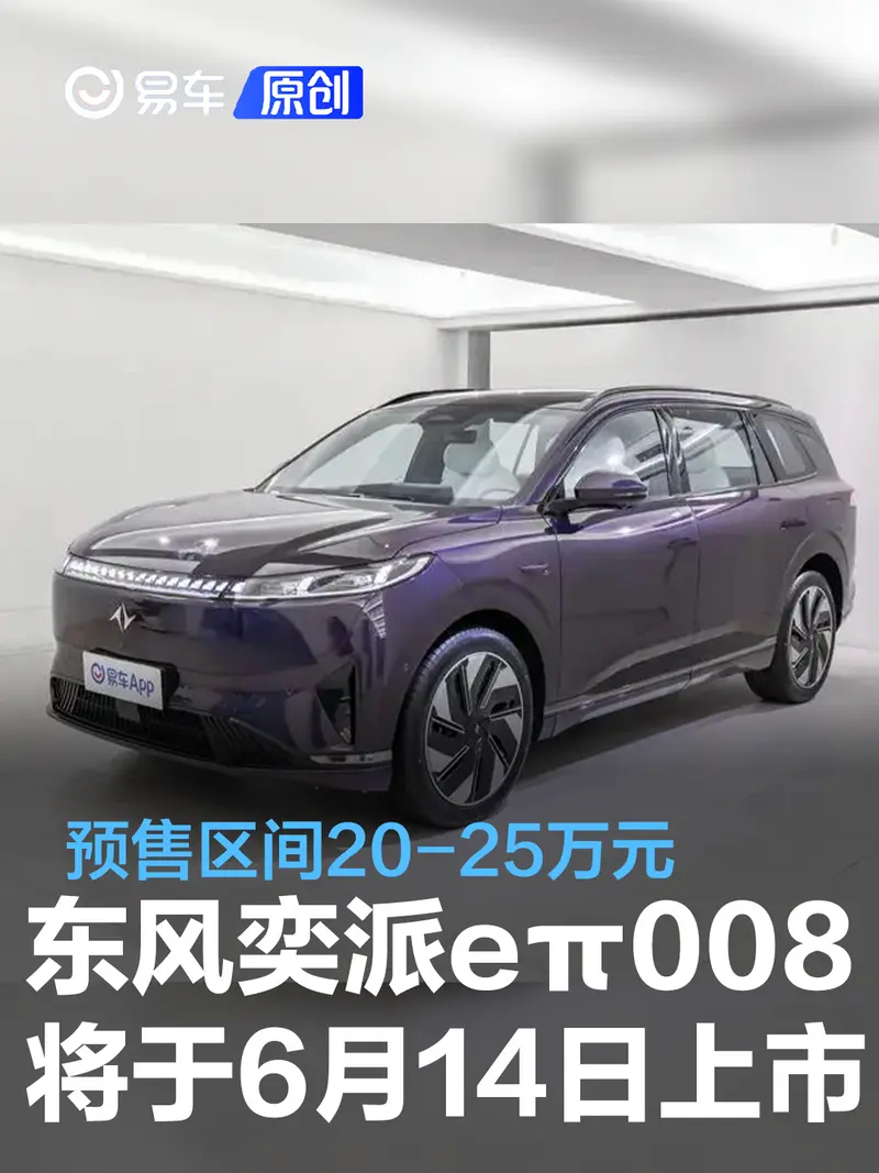 易车讯 我们从官方获悉,东风奕派eπ008将于6月14日正式上市。在2024北京车展上,东风奕派eπ008正式亮相并开启预售,预售区间20-25万元。据了解,新车定位为一款六座中大型SUV,提供纯电及增程两种动力供用户选择。