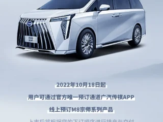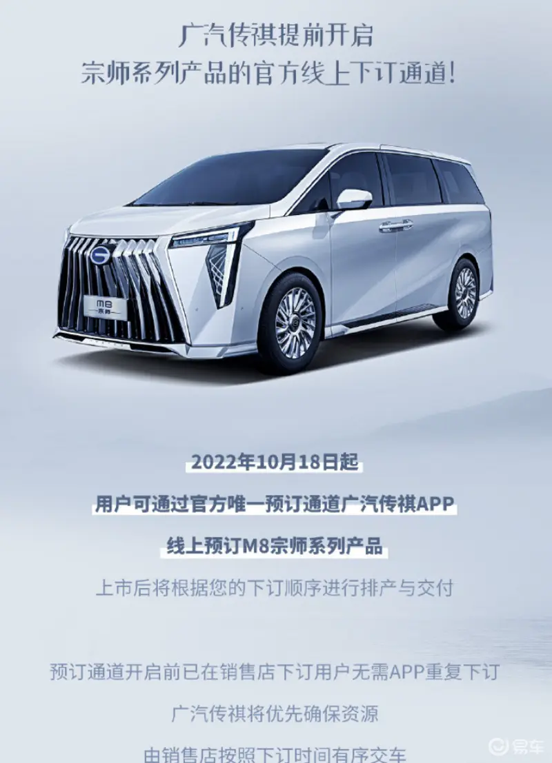 易车讯 我们从官方渠道获悉,广汽宗师系列将于10月18日开启线上预订,上市后将根据用户下单顺序进行排产与交付。据悉,M8宗师系列相比于大师系列与领秀系列有着更高的定位,也将成为M8产品线中的旗舰系列车型。