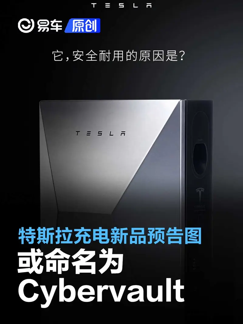 易车讯 日前,我们从相关渠道获得了特斯拉充电新品预告图,这款新产品可能会被命名为“Cybervault”,具有与Cybertruck纯电皮卡相似的设计理念,预计会拥有坚固的使用特性。
